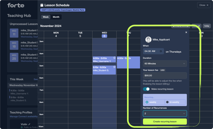 Click Create lesson/Create a recurring lesson to automatically add the lesson(s) to your teaching Schedule (calendar) on your Teaching Hub and to your student's list of upcoming lessons in their Forte Learning Hub.