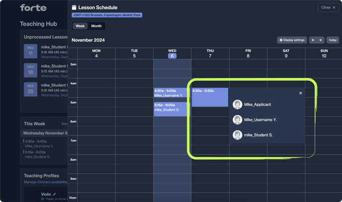 On Forte, teachers schedule the lessons with their students. That way, you have complete control over your own teaching schedule.