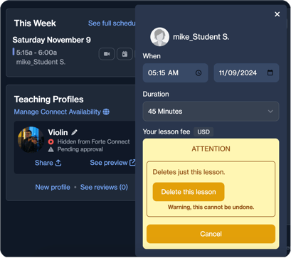 Caution: Keep in mind that canceling a lesson is permanent and cannot be undone.
