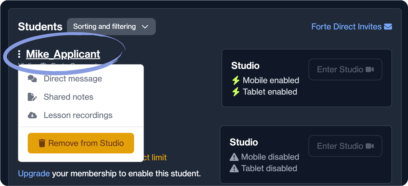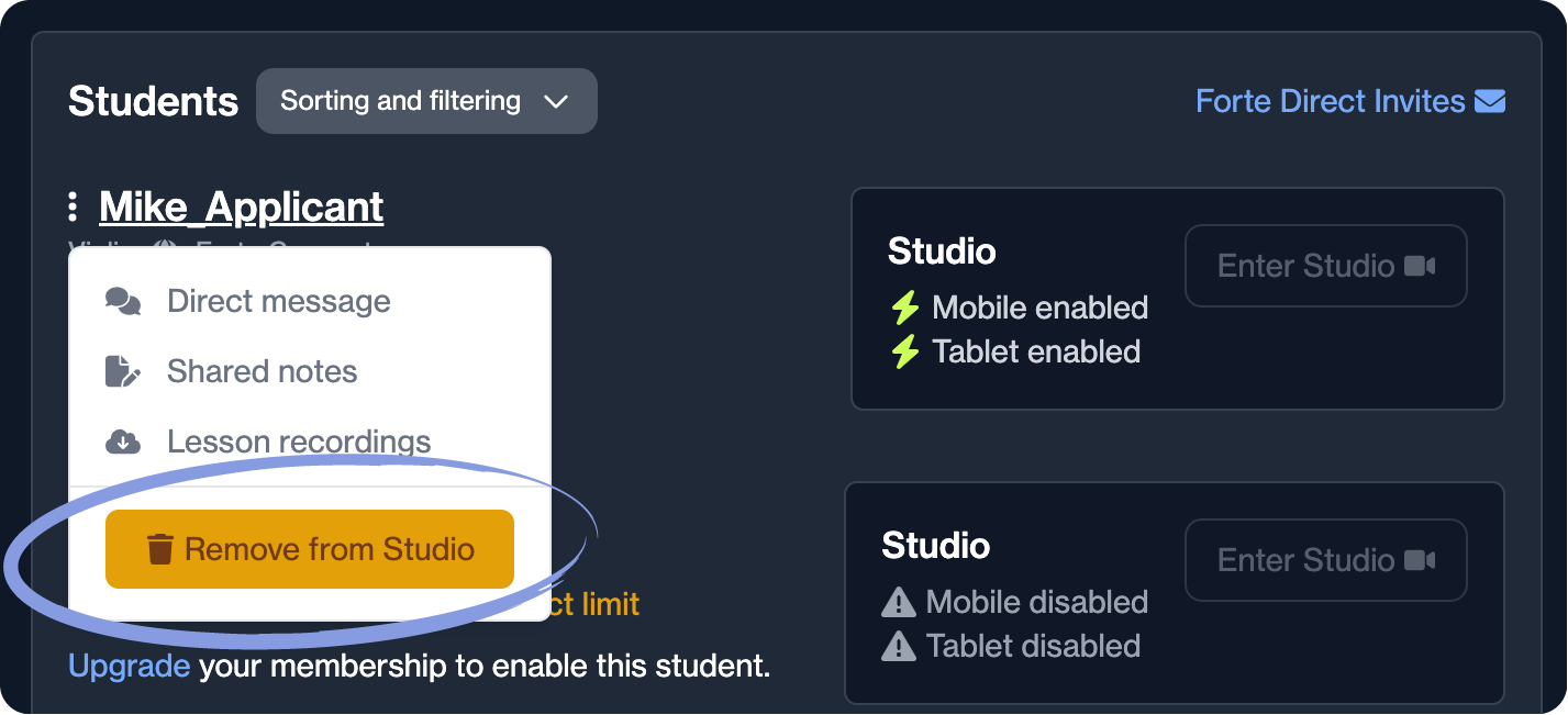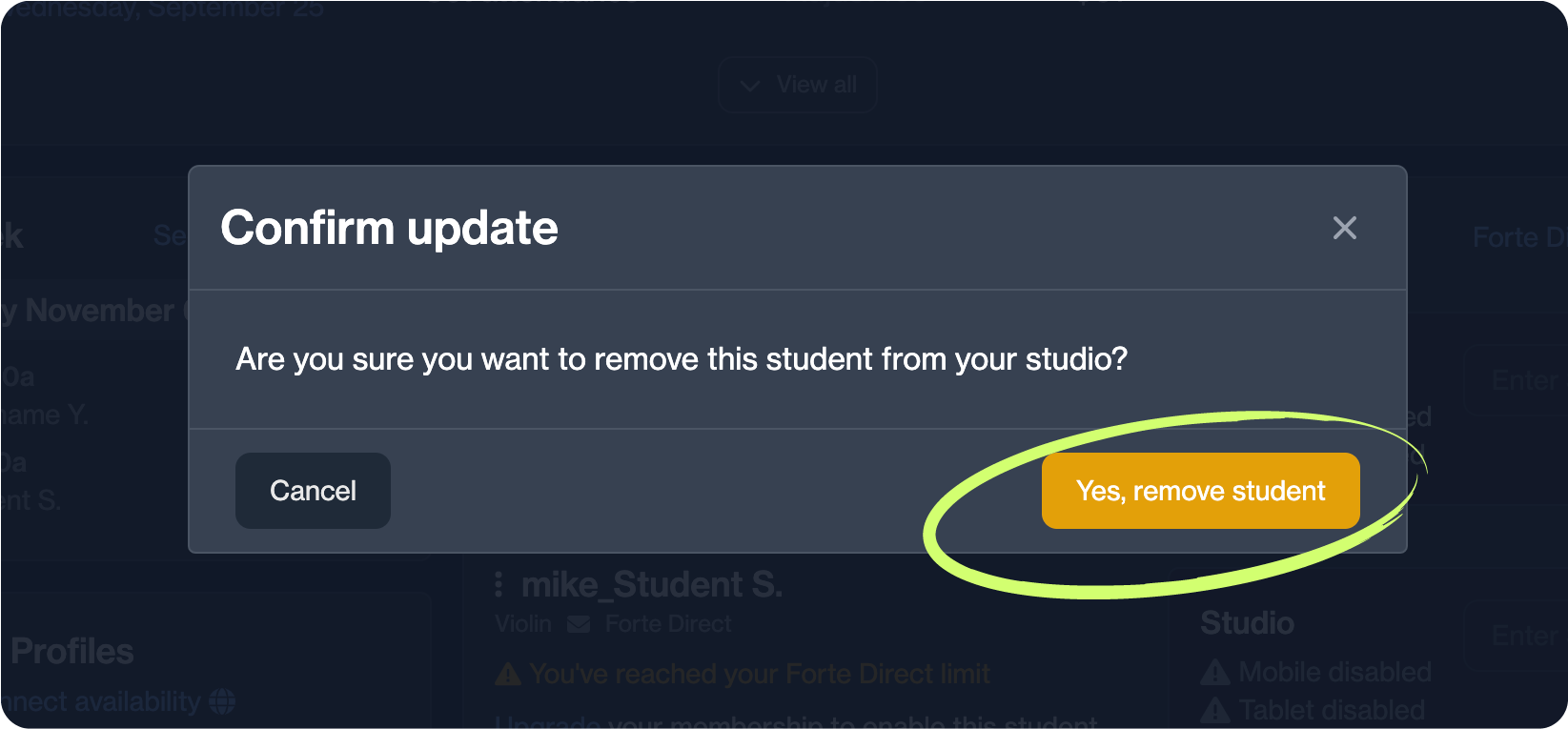 Warning: Once a relationship has been severed, you cannot re-add the student to your account. If you are having technical issues with the student's account, please email help@fortelessons.com for assistance before ending the relationship in Forte.