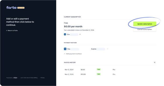 - You'll be taken to Stripe to complete the steps. Select Update Subscription.