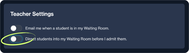 Scroll down to the Teacher Settings section, and toggle OFF the "Direct students into my Waiting Room before I admit them" option.