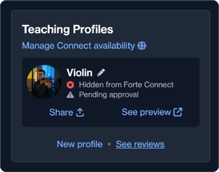 In the Teaching Profiles section of your Learning Hub, you'll manage your existing instrument public profiles and/or create new public profiles. Prospective students will find you on Forte Connect through your public profiles, based on instrument.