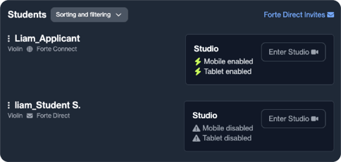 Access to the Forte teaching Studio with Forte Direct students is dependent on the type of teacher membership you've selected.
