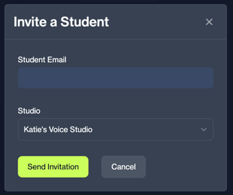 Use the Forte Direct Invites button at the top of the Students section to invite existing students to join your Forte Students list and take lessons with you in the Forte teaching Studio. Enter your student's email into the Student Email field, select the instrument Studio to which you'd like to invite your student, and click Send Invitation.